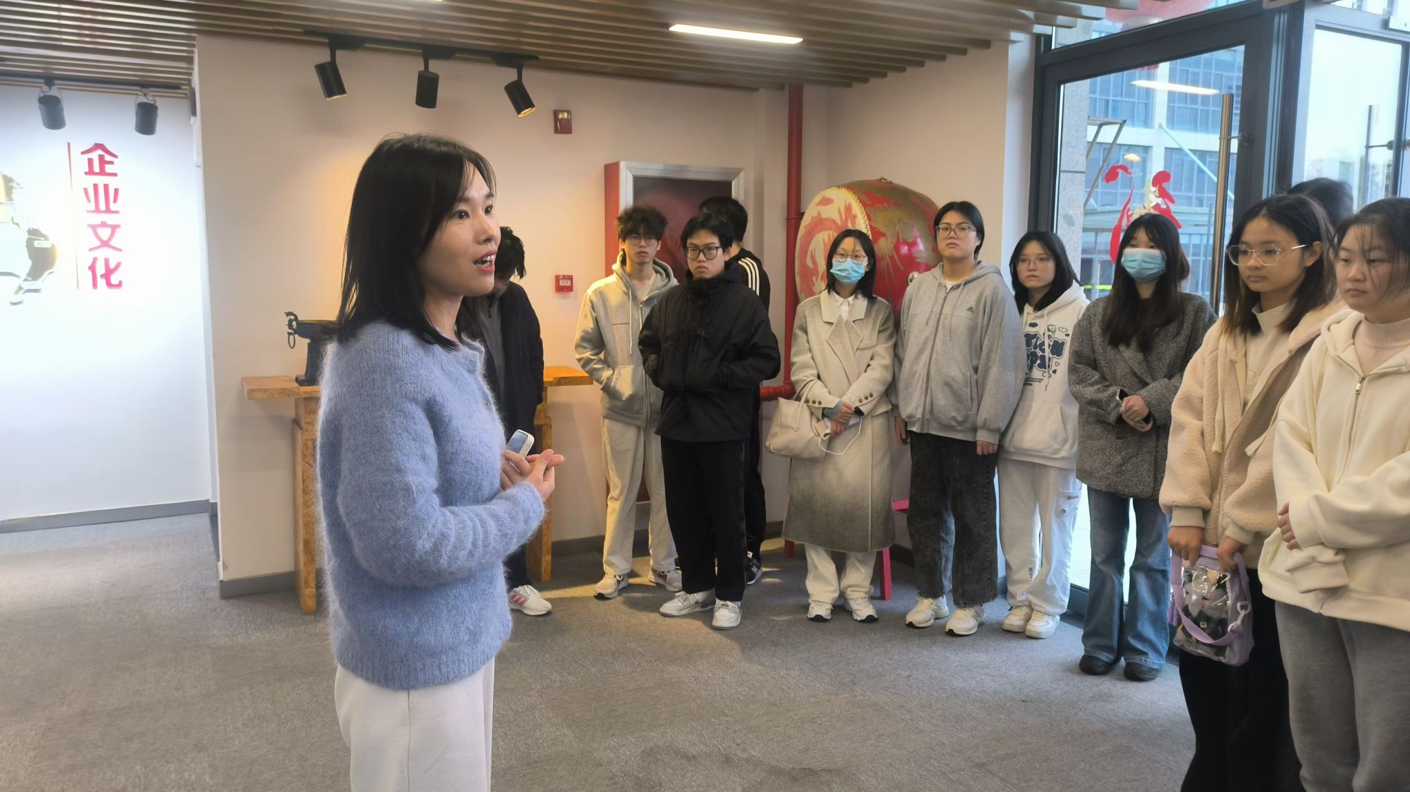 在企业人事经理郭静的热情接待下,学生们参观了公司的各个部门,包括产品展示厅、设计开发部、外贸业务部及物流仓储中心。通过业务经理范云飞的详细讲解,学生们了解了从服装设计到生产再到出口的全流程,特别是涉及与日本客户沟通、订单跟踪及质量把控等关键环节。