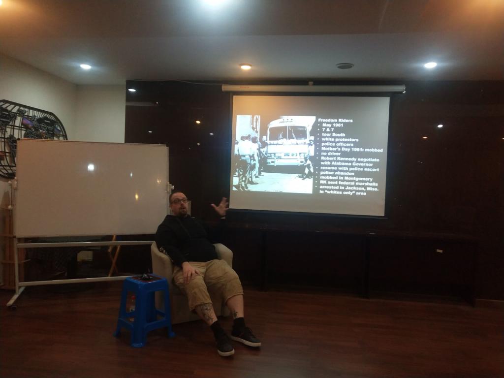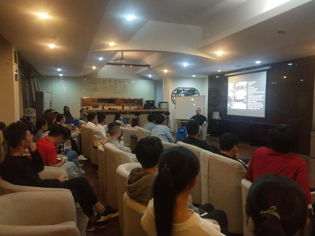 2019-2020年第一学期的第二次中外教教学沙龙在伟德国际英国咖啡吧如期举行,本次沙龙主讲人为美籍外教Nathan Tomey。 Nathan老师从太空战、肯尼迪、美国内战、嬉皮士、石墙事件以及吉姆•克劳法等六大主题全方位展示了20世纪60年代的美国,娓娓道来,带领我们穿越时光、穿越距离,去领略当时的跌宕时代。每一个主题都进行了前测、讲解与后测三个环节,环环相扣,引人入胜,每一个主题都是知识大讲堂,都是文化大洗礼,更是60年代美国的影片式生动再现。每一次Nathan老师的沙龙,可以毫不夸张地说,绝不辜负听众的每一分钟。