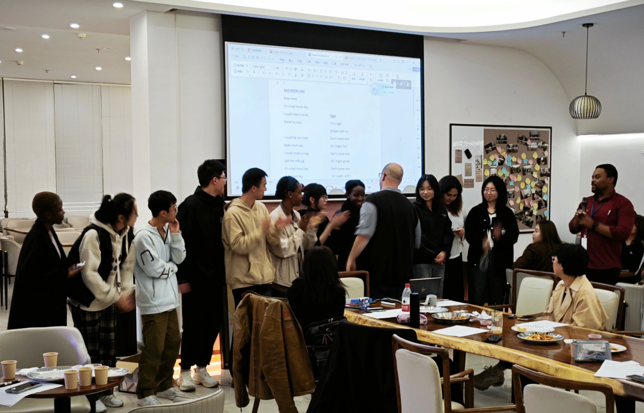 收官之时,同学与老师们热情地分享着自己创作的诗赋,并选出了最受欢迎的几位“诗人”。本次精彩活动在外教Kay的总结声中圆满落幕,不仅为同学们提供了展现语言艺术魅力的舞台,还搭建起中西诗学对话的桥梁。虽然活动已落下帷幕,但同学们的诗性不止,余韵绕心,相信诗歌的力量能化作他们进步的催化剂。