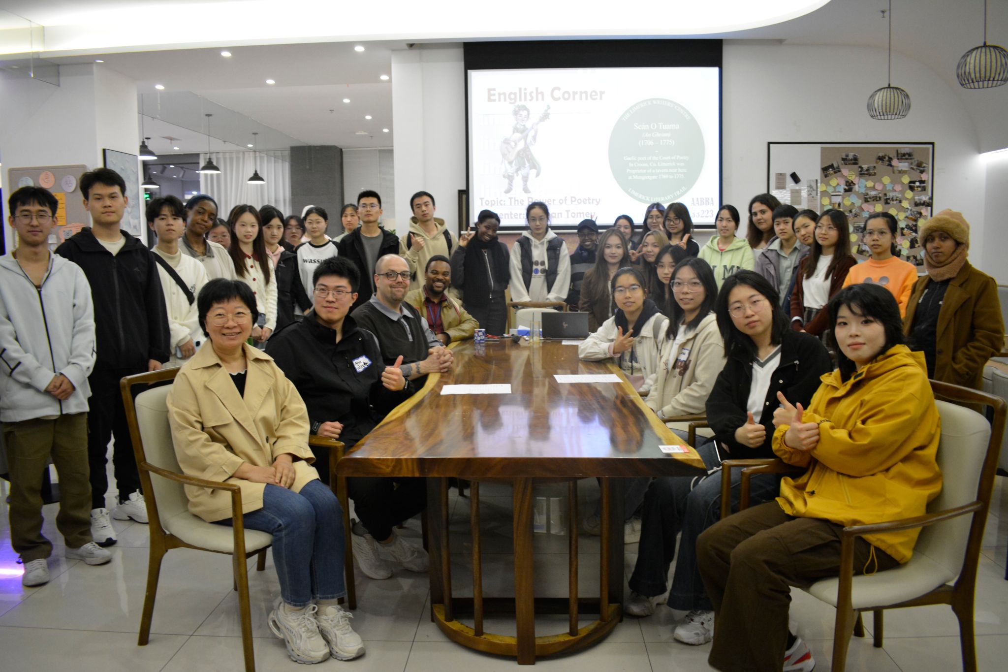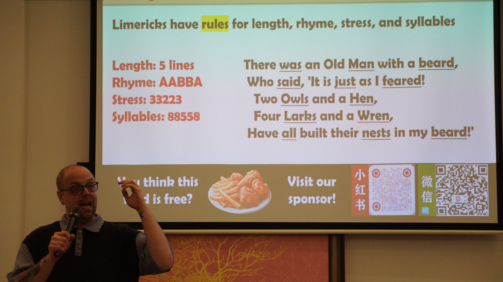 外教Nathan介绍了诗人Seán O Tuama与“Limerick”(五行打油诗)。他以自己写的Limerick起头,引入了本场活动的第二个环节——“Limerick创作”。有人执着于遣词造句的推敲过程,也有人享受即兴成诗的一气呵成。