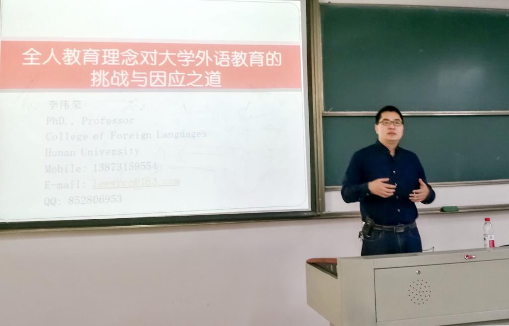 2017年11月2日下午,应伟德国际英国邀请,湖南大学伟德国际英国李伟荣教授在教二B 217作了一场题为《全人教育理念对大学外语教育的挑战及其因应之道》的学术报告。报告会由唐艳芳院长主持,英语系和大外部教师到场听取了本次讲座。