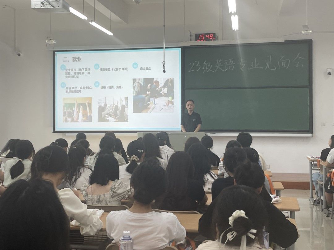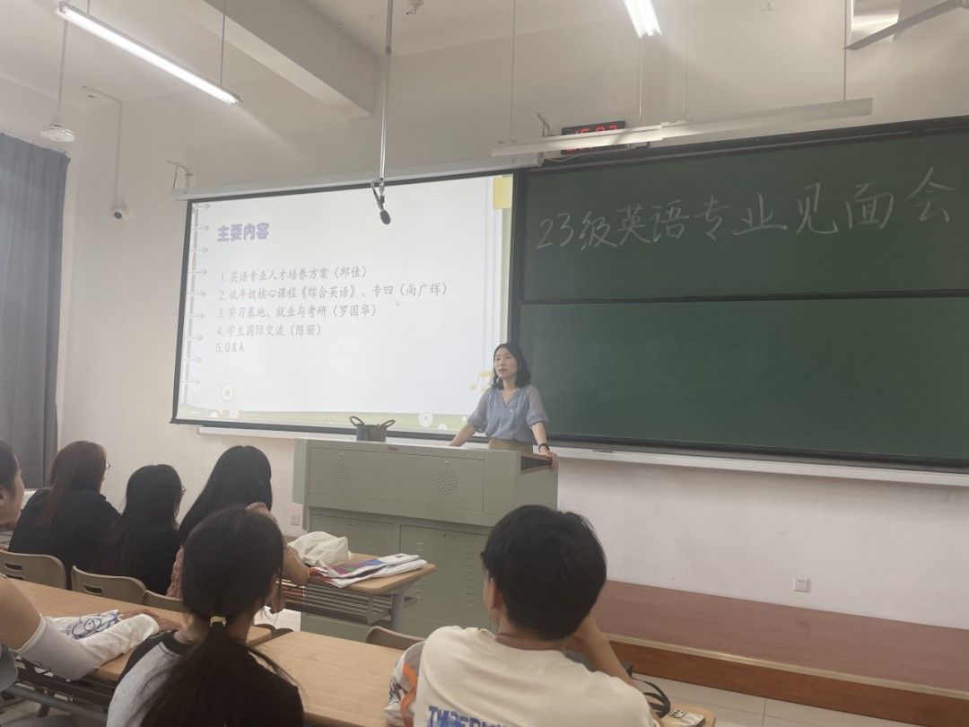 又是一年开学季,正是橙黄橘绿时。美丽的嘉院迎来了90位来自祖国四面八方的英语专业新生。他们怀揣梦想,带着憧憬,走进伟德国际英国,开启了新的人生之旅。为帮助新生更快适应大学生活,2023年9月10日下午,英语系在兴德楼123举办2023级英语专业新生见面会。会议由英语系主任邱佳博士主持,英语系尚广辉老师、陈丽老师、罗国华老师等出席。他们从人才培养方案、基础英语学习、专业等级考试、实习就业、考研留学等方面与新生做了面对面交流。