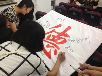 诵读《弟子规》,听“点水之恩 涌泉相报”的劝善良言,让大家时刻牢记感恩要重在行动。最后,同学们在主持人的倡议下,纷纷在“德”字签上自己的姓名,承诺要常怀感恩、重在回馈。