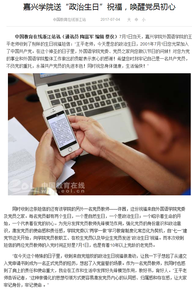 中国教育在线网刊登了我院的新闻--送“政治生日”祝福,唤醒党员初心
