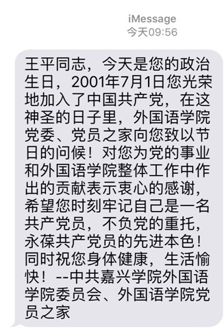 7月1日正值党的生日,嘉兴学院伟德国际英国的两位老师在特殊的日子里,收到了别样的生日祝福短信:
