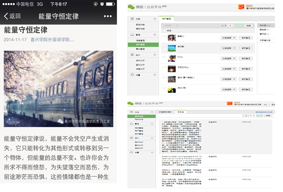 “红船微信课堂”自2014年底建立以来,以其“短、快、新”特色,坚持做到“每日一课”,改变传统阅读模式,使党员学习实现“正能量随身带、新知识随时学”,本学期开设“党校课堂我参与活动改变以往信息单纯由一人发放的模式,参与者可将图文信息发送到审核人手中,集中筛选优质信息逐日发送,图文信息将显示信息报送员姓名,此方法受到学生党员和部分入党积极分子的积极关注,也吸引了部分非党员教师、同学关注。“手机党校”打破了党员学习固定的空间限制,通过一种以自然的、潜移默化的方式传递思想、反映动态、展示先进、成为助推党的群众路线教育实践活动深入开展的有力推手。