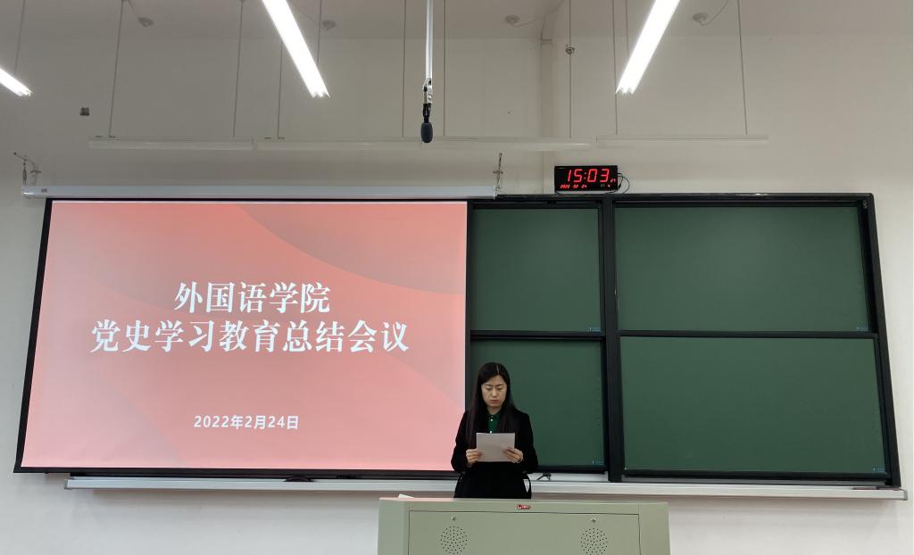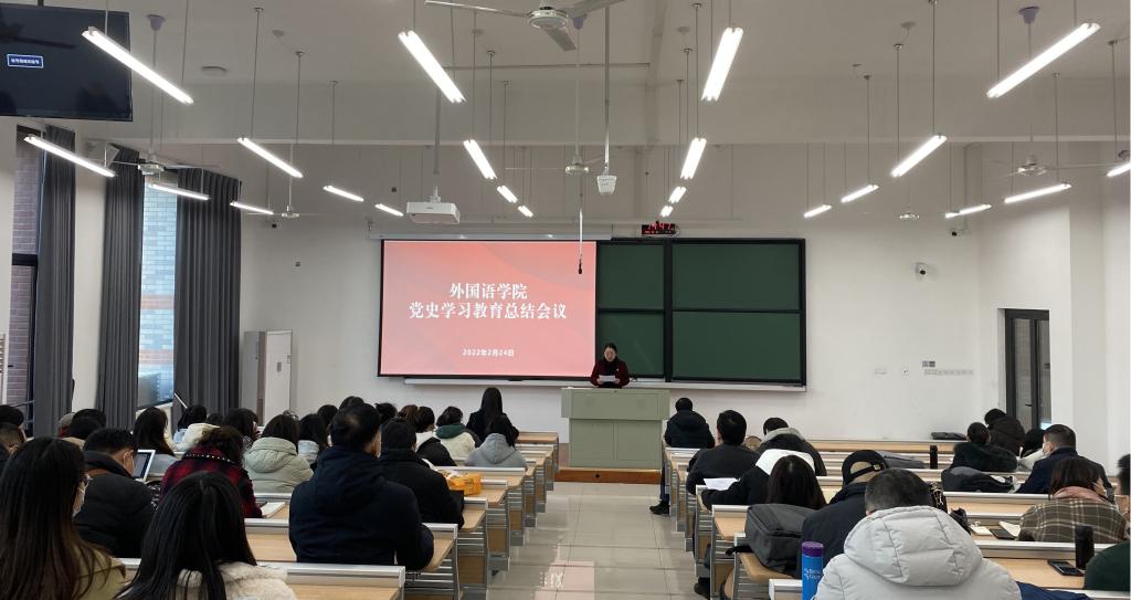 周钰分析了学院党史学习教育存在的不足和短板。她强调,学习党史、从百年党史中汲取智慧力量永远在路上,要把党史学习教育融入日常、抓在经常,建立健全常态化、长效化制度机制,不断巩固拓展党史学习教育成果,全面推进高质量发展再上新台阶;要坚持系统观念和目标导向,把学习党史与推动学院业务工作紧密结合起来,将学习成效转化为实践动力,在“两个一百年”奋斗目标历史交汇的关键节点,更好地扛起办好党的诞生地人民满意教育的光荣使命,落实学校第四次党代会确定的“1358”发展战略,奋力将外语品牌特色打造成展现学校风貌的重要名片,助力学校建设有特色、善创新的一流应用型综合性大学。