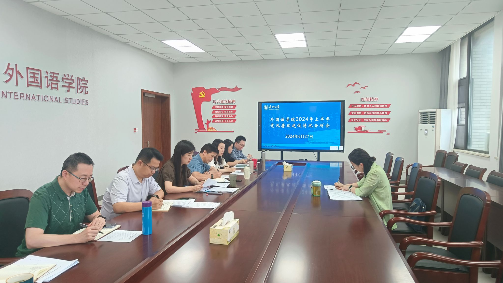 杨碧瑜作总结发言,认为本次分析会准备充分、分析到位,学院党建工作富有特色、成效突出,班子成员团结和谐、政治生态好,并提出三点希望:一是要着力发挥党委的政治核心作用,层层压实党风廉政建设责任,结合党纪学习教育工作要求,认真排查存在的廉政风险点,提高风险防范意识;二是要将党风廉政建设工作与学院中心工作相融合,以高质量党建引领学院在学科建设、专业建设、人才培养等方面的高质量发展;三是要聚焦“清廉二级学院”示范点建设,做好“廉润初心”廉洁文化品牌建设,推进党风廉政建设持续向好发展,营造风清气正的良好氛围。
