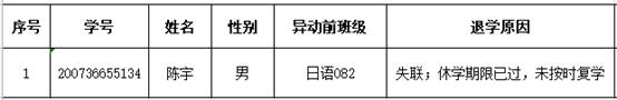 根据《普通高等学校学生管理规定》(中华人民共和国教育部令第41号)中关于学籍管理的相关条款,伟德国际英国日语082班陈宇同学休学期满,在学校规定期限内未提出复学申请,经伟德国际英国党政联席会议研究,该同学(详细信息见附表)已达到退学条件,决定提交学校校长办公会议,拟按照退学处理,特此公告。