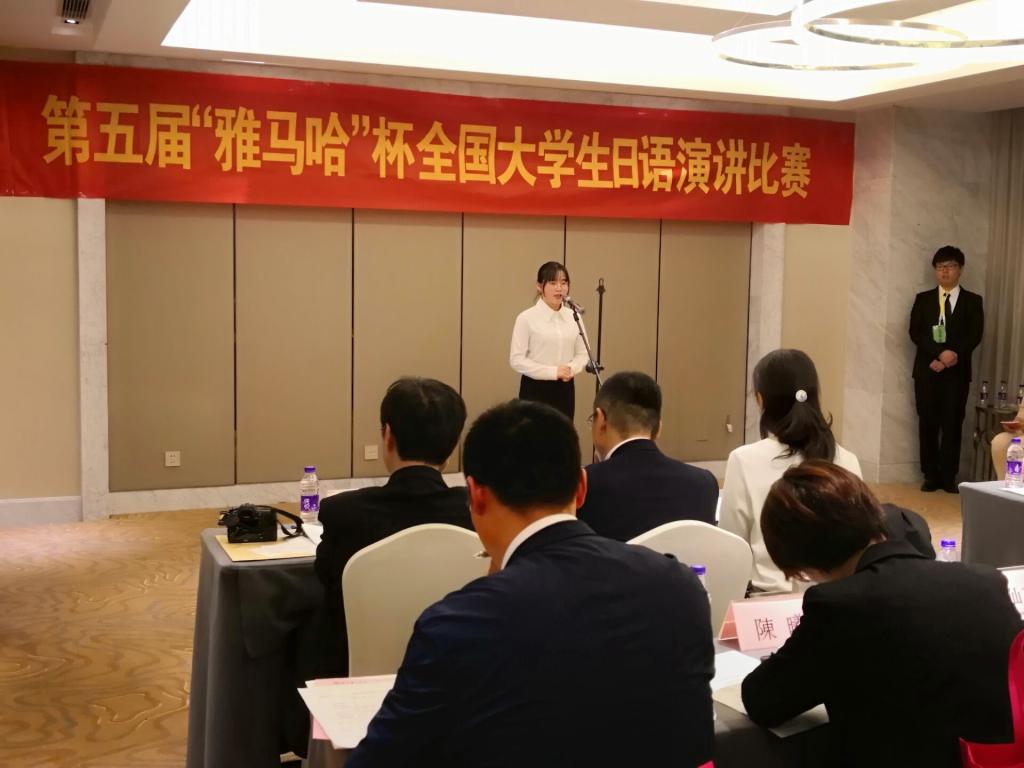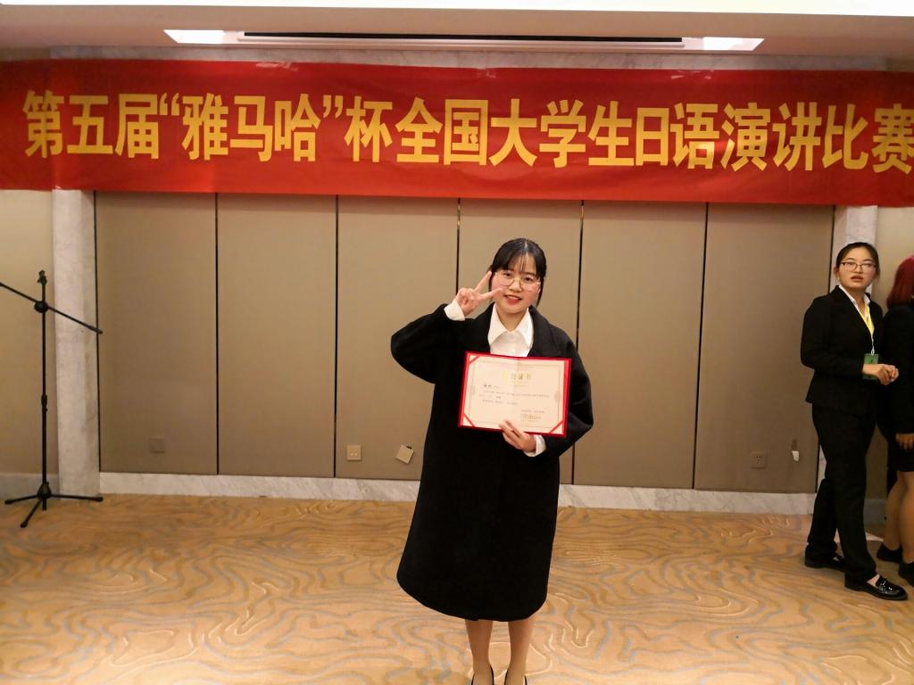 4月14日,我院日语专业2016级徐欢同学参加了由全国11省共42所高校日语专业学生激烈角逐的第五届“雅马哈”杯全国大学生日语演讲大赛,她一路拼搏,过关斩将,挺进决赛,并最终收获三等奖,与上海财经大学、浙江理工大学、东华大学和洛阳伟德国际英国等日语专业的同学并列站在了领奖台上。