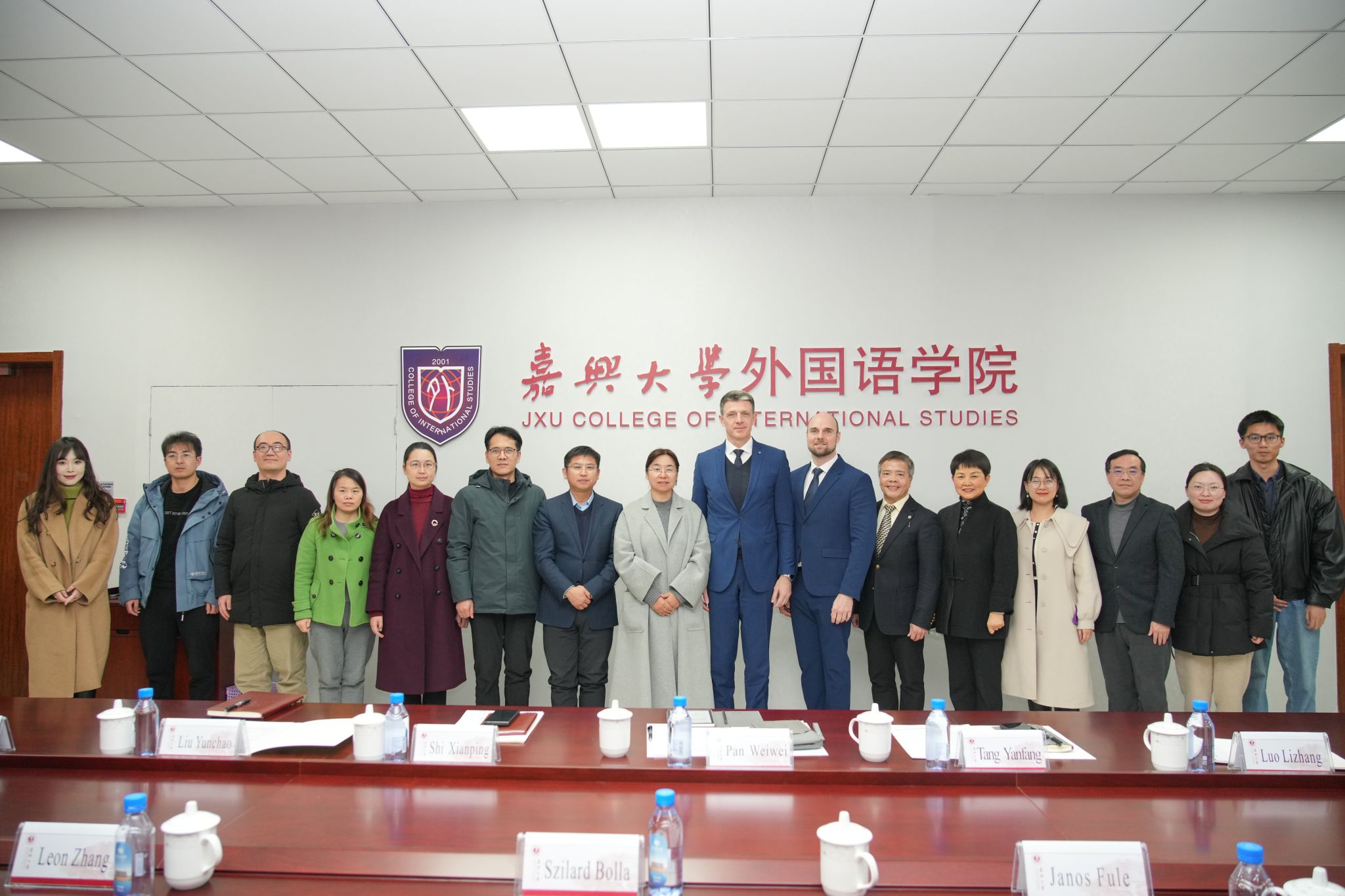 1月7日,匈牙利驻沪总领事馆原总领事西拉德·博岚先生(Szilárd Bolla)、嘉兴市人民政府外事办公室二级调研员庄玉娥女士、匈牙利驻沪总领事馆文化领事雅诺什·富勒先生(János Füle)、匈牙利驻沪总领事馆文化领事助理张靖访问伟德国际英国,就伟德国际英国中东欧文化经济研究中心建设相关事宜进行会谈。国际交流与合作处处长潘巍巍、伟德国际英国院长唐艳芳、文法学院学术院长石贤平、马克思主义学院副院长罗理章、国际教育学院副院长刘韵超,中东欧文化经济研究中心成员及年轻博士出席会议。会议由唐艳芳主持。