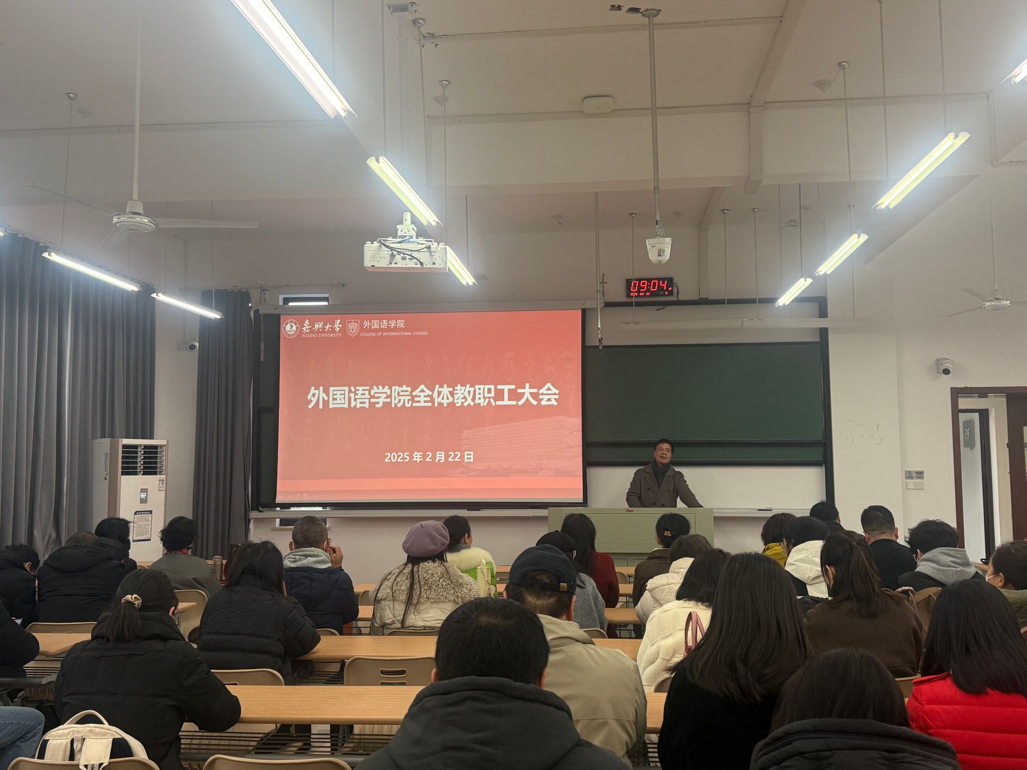 院长唐艳芳回顾了学院在过去一年里,在党的建设、教学质量提升、科研成果产出、教育国际化等方面取得的显著成绩,同时也对学院2025年重点工作进行了展望,强调要进一步加强师资队伍建设,推进教育教学改革,做好硕士研究生招生工作,加大科研标志性成果产出力度,推动学院科研工作再上新台阶。他希望全体教职工勇于担当、积极作为,以更加务实的作风和更加坚定的信心,迎接新学期的挑战与机遇;凝心聚力、团结奋进,狠抓工作落实,奋力谱写学院高质量发展的新篇章。学院领导班子其他成员分别对教学工作、学生考研、就业、安全工作等做了具体工作部署。